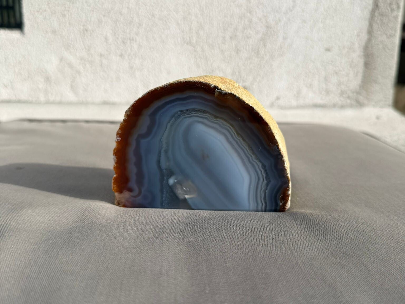 Prachtig agaat standvlak, een echte blikvanger voor elk interieur. Dit unieke stuk is zorgvuldig geslepen en gepolijst, waardoor de natuurlijke patronen en kleuren van de agaat prachtig naar voren komen.