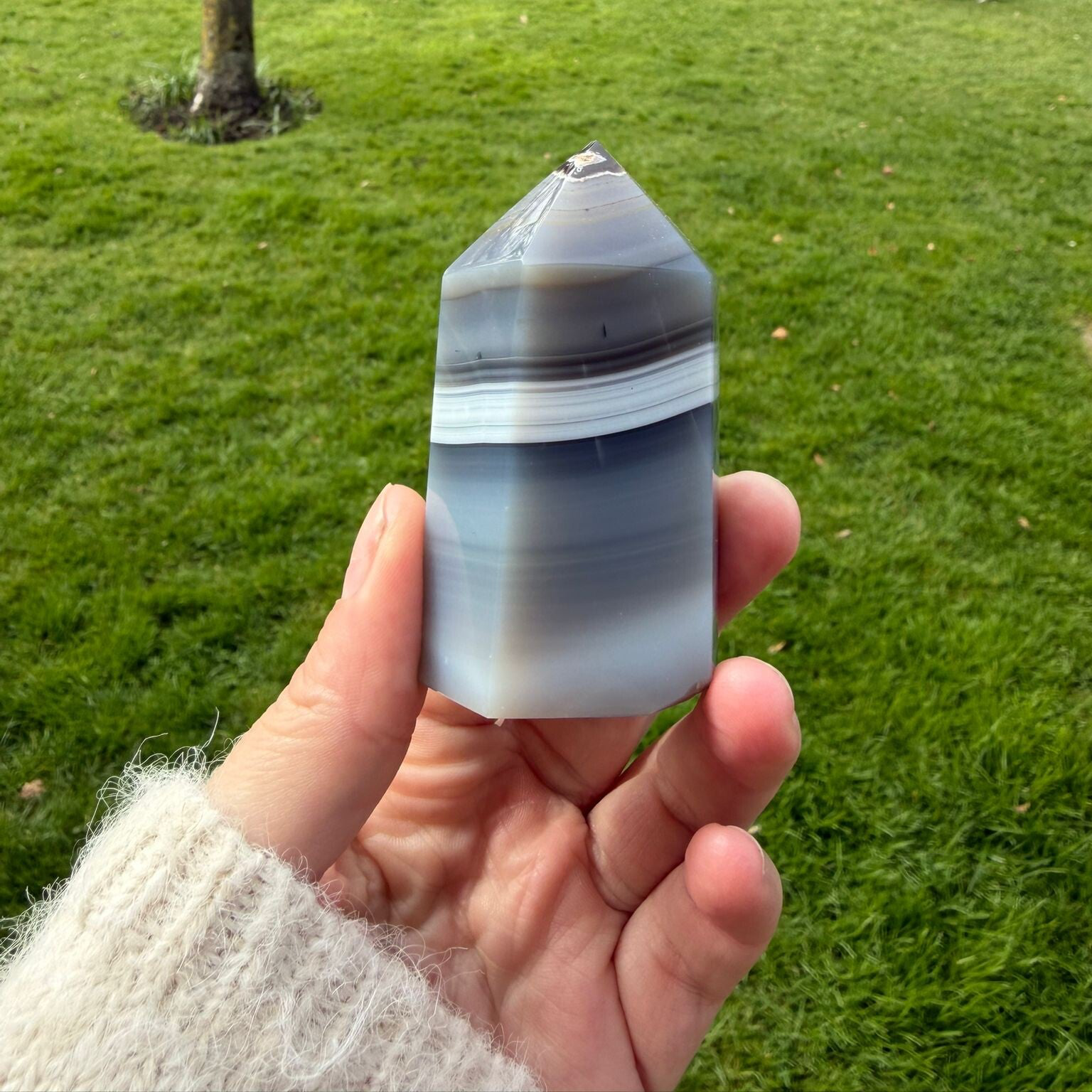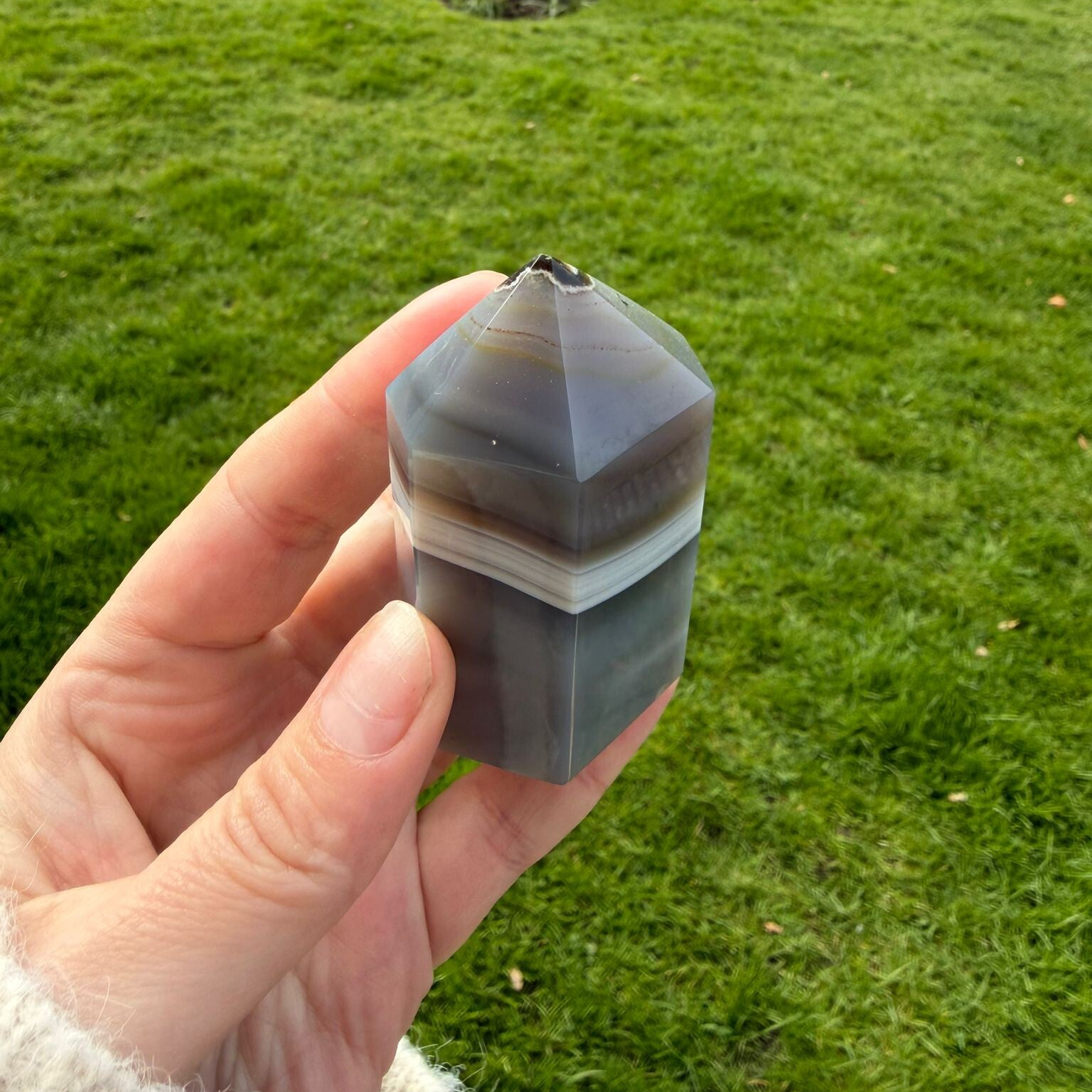 Mooie agaatpunt van 135 gram met natuurlijke kleurschakeringen en unieke banding. Zorgvuldig geslepen en stevig staand. Agaat staat bekend om zijn aardende en rustgevende werking.Uniek exemplaar je ontvangt exact deze punt.