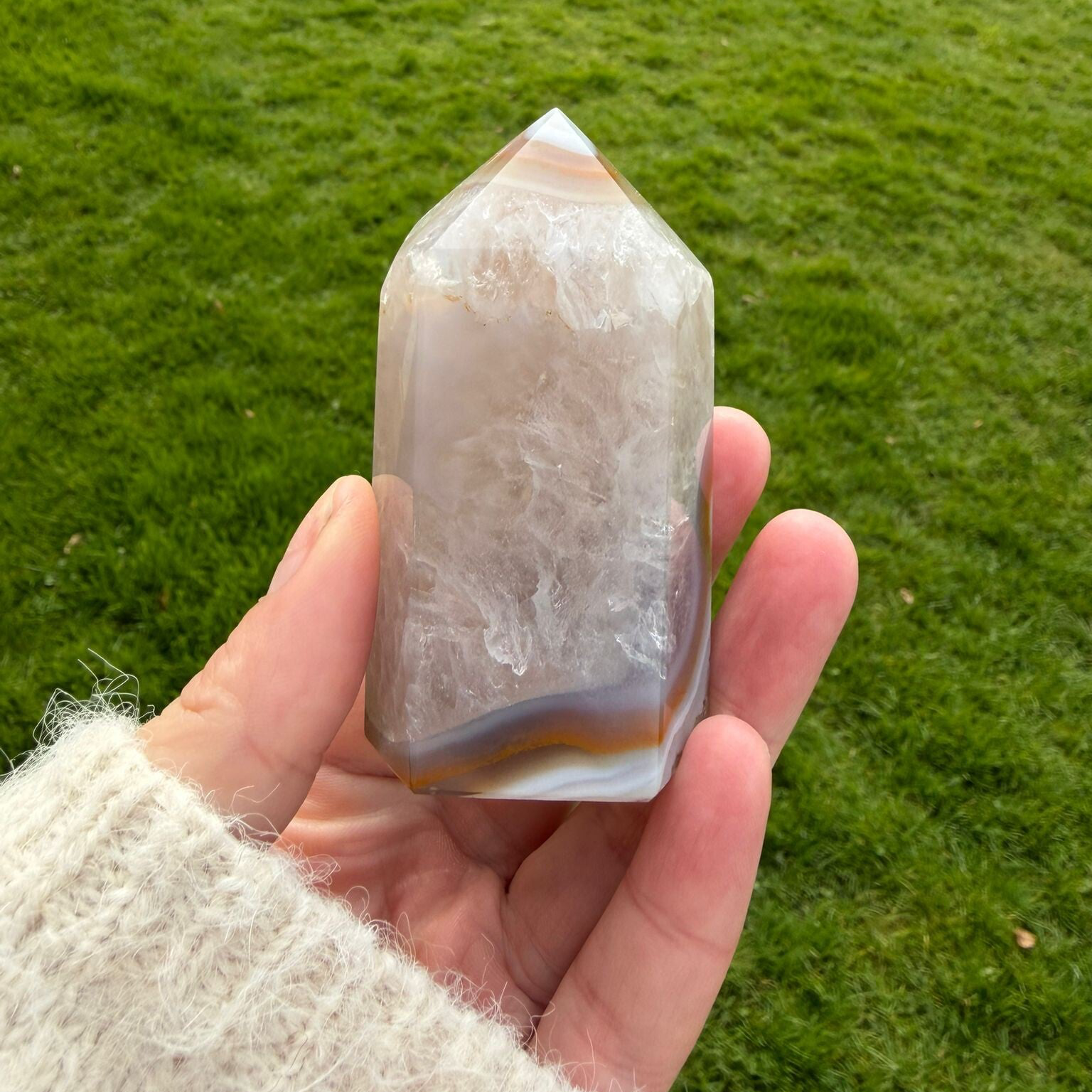 Mooie agaatpunt van 170 gram met natuurlijke kleurschakeringen en unieke banding. Zorgvuldig geslepen en stevig staand. Agaat staat bekend om zijn aardende en rustgevende werking.Uniek exemplaar je ontvangt exact deze punt.