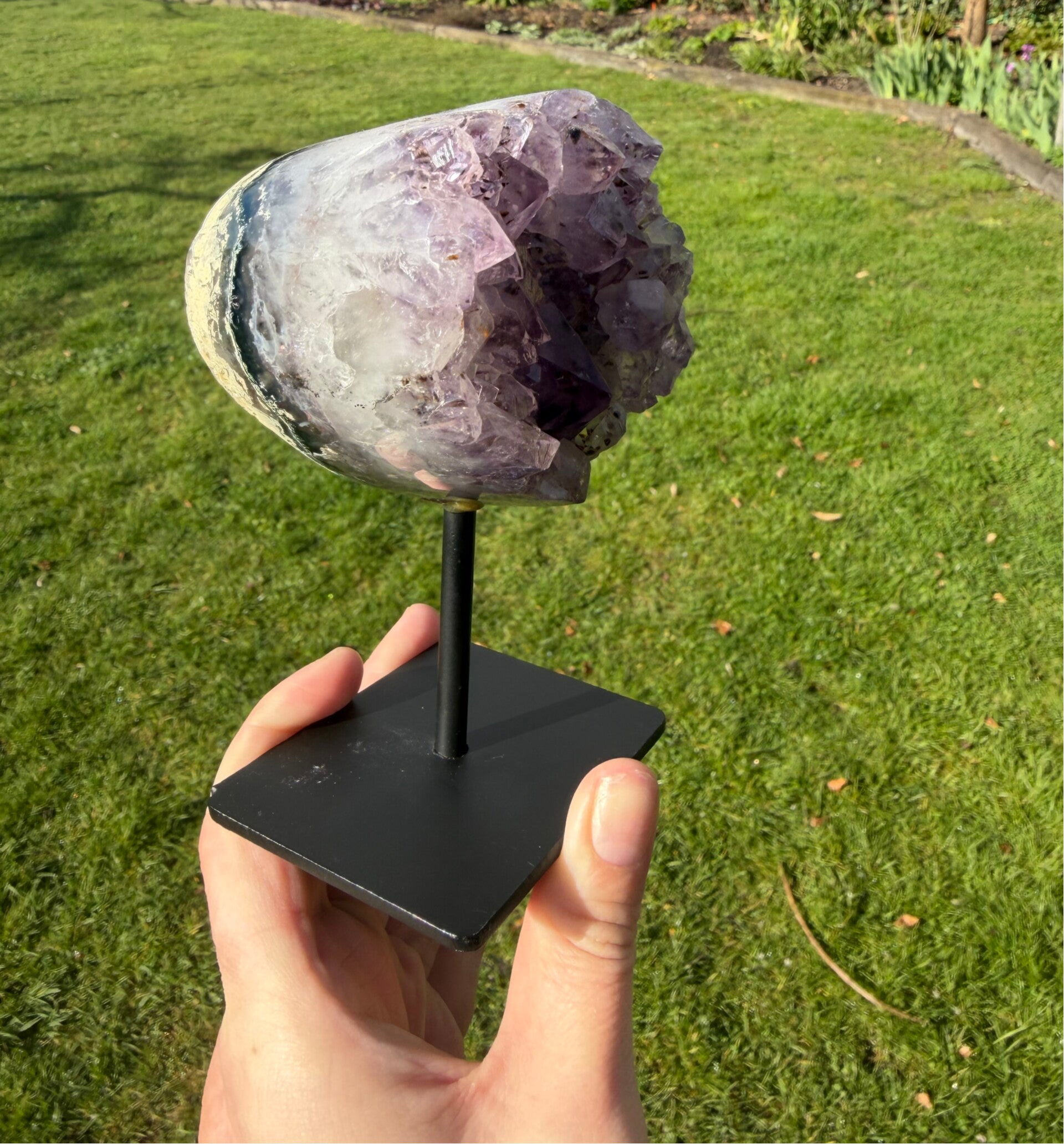 Dit stijlvolle amethist hart op standaard combineert natuurlijke schoonheid met een rustige, harmonieuze uitstraling. De verfijnde paarse tinten en open kristalstructuur maken elk stuk uniek en zorgen voor een elegante toevoeging aan ieder interieur.